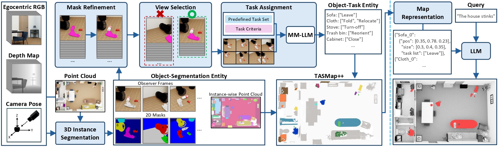 (Left) Overview of the proposed framework. Given RGB-D sequence and camera pose as input, 3D Instance Segmentation module returns Object-Segmentation Entity with regarding reconstructed point clouds. Subsequently, through the Mask Refinement, View Selection and Task Assignment modules, we obtain the Object-Task Entity. Based on these two entities, TASMap++ is constructed. (Right) Process of Context-Aware Grounding used in experiments.